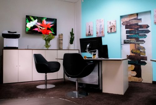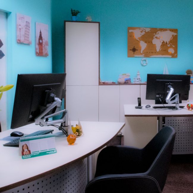 eines Reisebüros mit 2 Berater- und 4 Besucherplätzen.