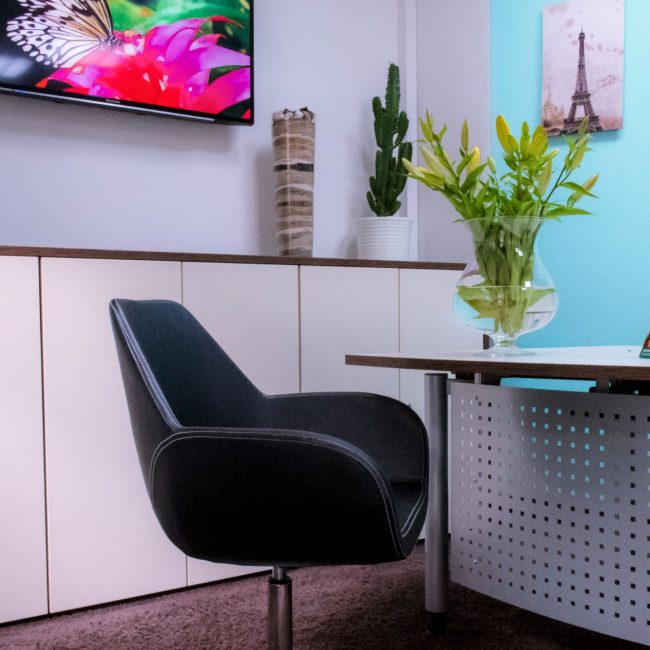 Auf Grund der geringeren Größe der Geschäftsräume wurde auch hier bei der Wahl der Möbel auf eine helle Ausführung beim Dekor geachtet. Um dies nicht langweilig wirken zu lassen wurden vereinzelt Akzente durch ein dunkleres Dekor gesetzt.