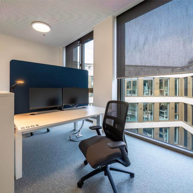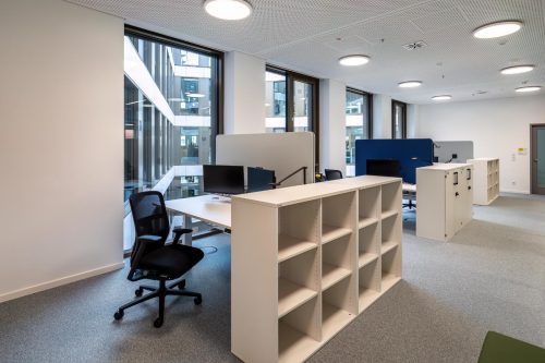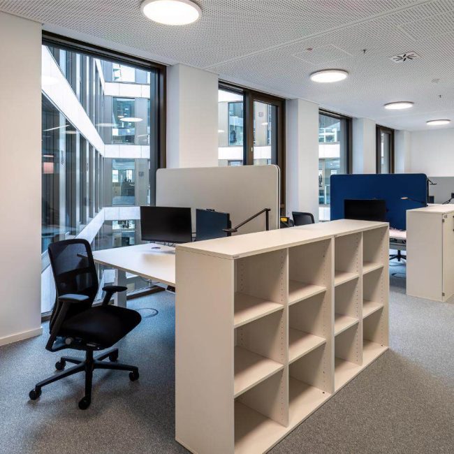 Die Mehrplatzbereiche sind hell, funktional und klar gegliedert. Individuelle Stauraum-Möglichkeiten und schlichte Trennelemente strukturieren den Raum, ohne ihn zu zerschneiden. Höhenverstellbare Schreibtische ermöglichen ergonomisches Arbeiten im Sitzen wie im Stehen – ein fester Bestandteil neuer Arbeitswelten, die auf Gesundheit und Flexibilität setzen. Alles ist bewusst auf das Wesentliche reduziert, damit Teams konzentriert und unkompliziert zusammenarbeiten können.