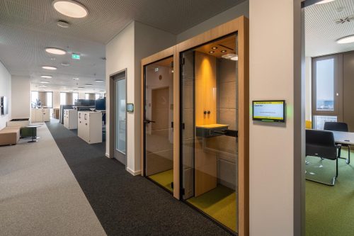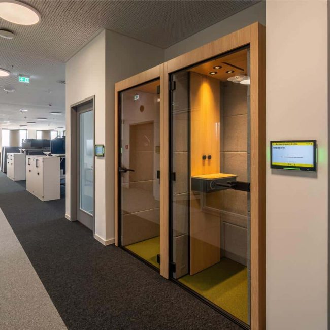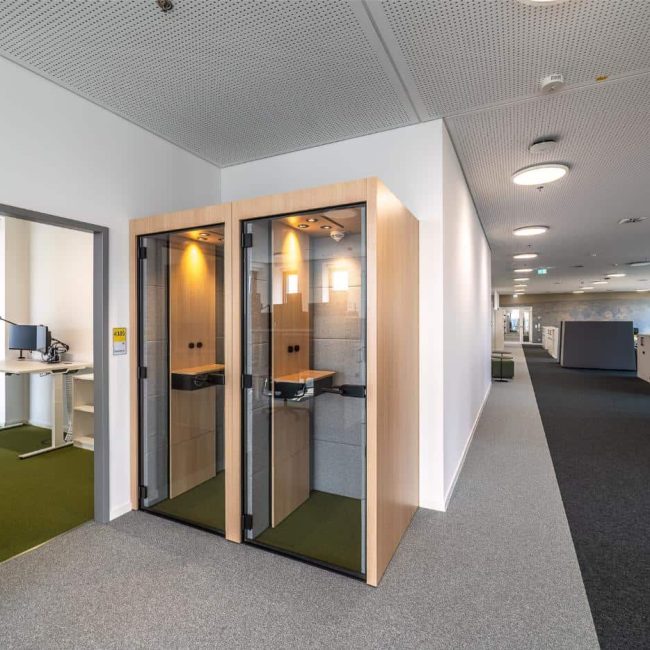 Gerade in offenen Arbeitsbereichen braucht es Orte, an denen man sich kurz zurückziehen kann – für konzentriertes Arbeiten oder vertrauliche Gespräche. Die integrierten Telefonboxen bieten dafür genau den richtigen Rahmen: ruhig, akustisch abgeschirmt und gut belüftet. Sie sind Teil des offenen Raumkonzepts und ermöglichen Rückzug, ohne die Verbindung zum Team zu verlieren. So entsteht ein ausgewogenes Verhältnis zwischen Offenheit und Privatheit im Arbeitsalltag.