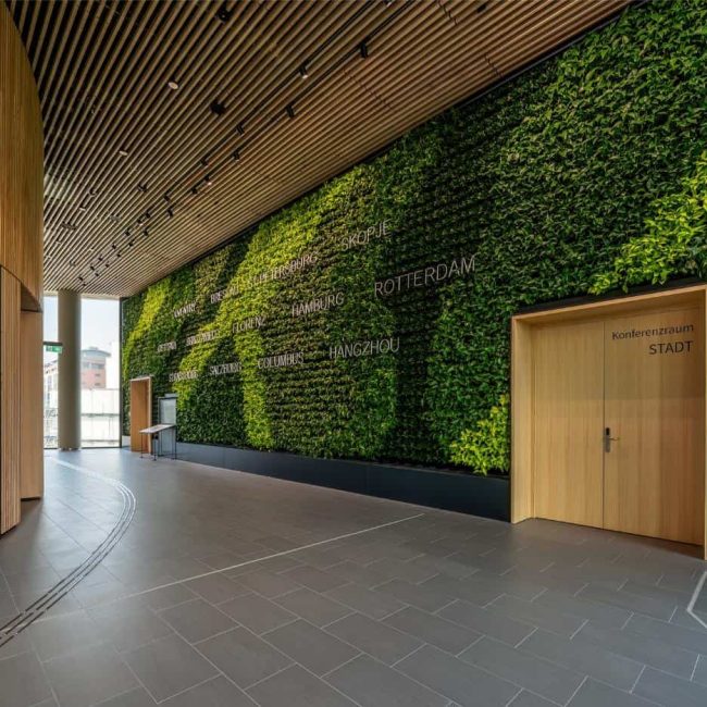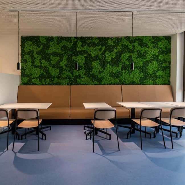 Die Cafeteria bringt Wärme und Aufenthaltsqualität in den Arbeitsalltag. Holzoberflächen, gedeckte Farben und eine begrünte Wand schaffen ein Umfeld, das einladend wirkt. Hier ist Raum für Erholung – sei es beim Kaffee am Vormittag, in der Mittagspause oder beim kurzen Gespräch zwischendurch. Ein Ort, der Begegnung ermöglicht, ohne aufdringlich zu wirken – und der Gemeinschaft fördert, ohne sie zu erzwingen.