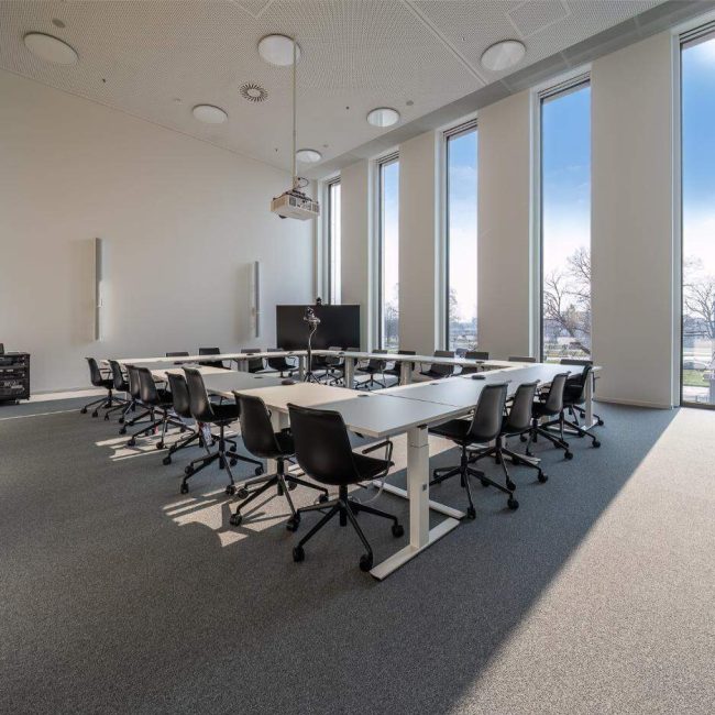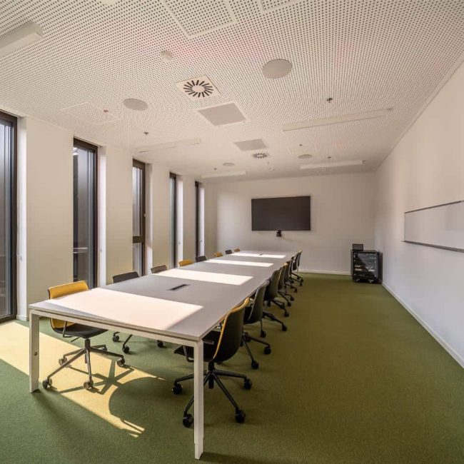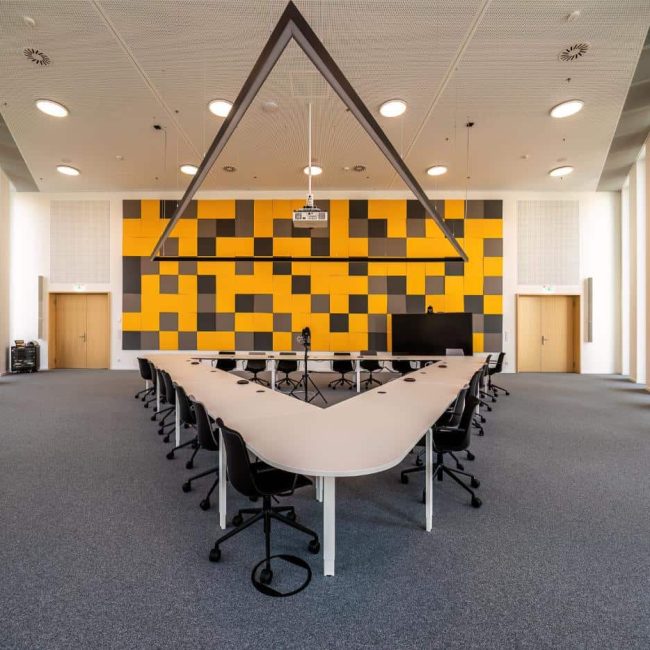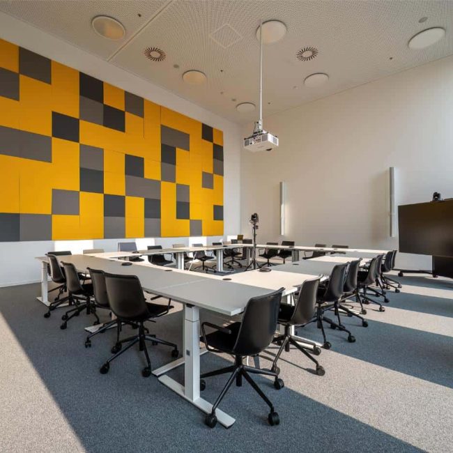 Der Sitzungssaal kombiniert flexible Möblierung mit klarer, reduzierter Gestaltung. Die großformatige Akustikwand in Gelb und Grau setzt einen gestalterischen Akzent und sorgt gleichzeitig für eine angenehme Raumakustik. Moderne Medientechnik ermöglicht professionelle Besprechungen. Viel Tageslicht und eine großzügige Raumhöhe schaffen eine offene Atmosphäre, in der auch längere Termine konzentriert ablaufen können. So wird der Raum zur Schnittstelle für Austausch, Entscheidung und Zusammenarbeit.
