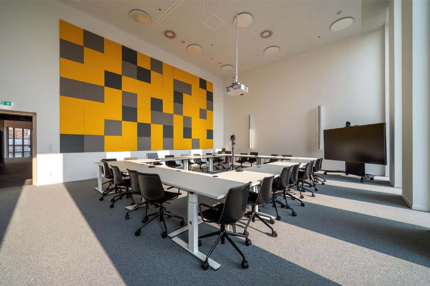 Der Sitzungssaal kombiniert flexible Möblierung mit klarer, reduzierter Gestaltung. Die großformatige Akustikwand in Gelb und Grau setzt einen gestalterischen Akzent und sorgt gleichzeitig für eine angenehme Raumakustik. Moderne Medientechnik ermöglicht professionelle Besprechungen. Viel Tageslicht und eine großzügige Raumhöhe schaffen eine offene Atmosphäre, in der auch längere Termine konzentriert ablaufen können. So wird der Raum zur Schnittstelle für Austausch, Entscheidung und Zusammenarbeit.